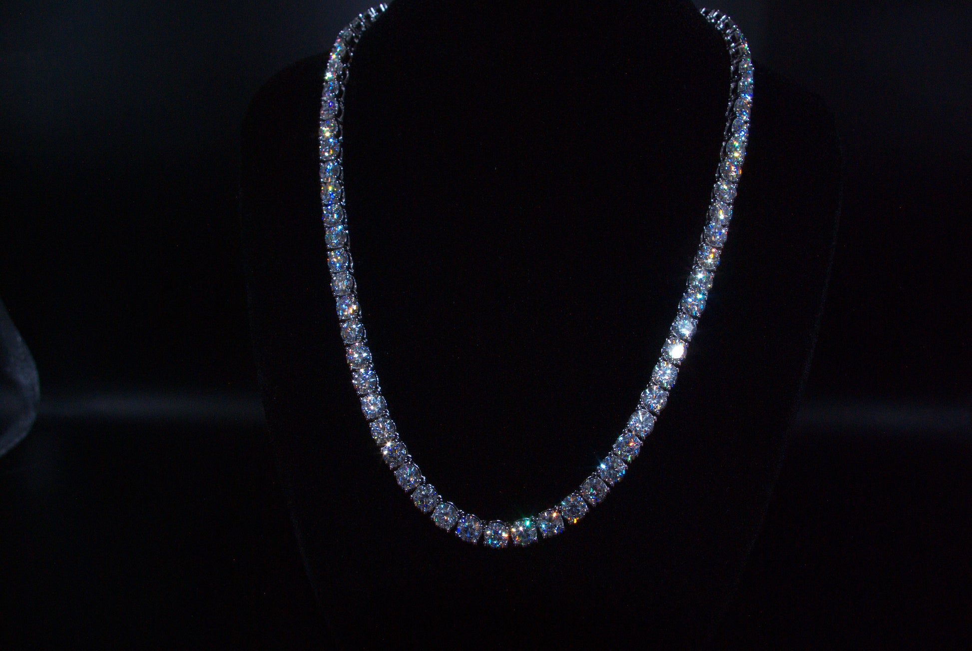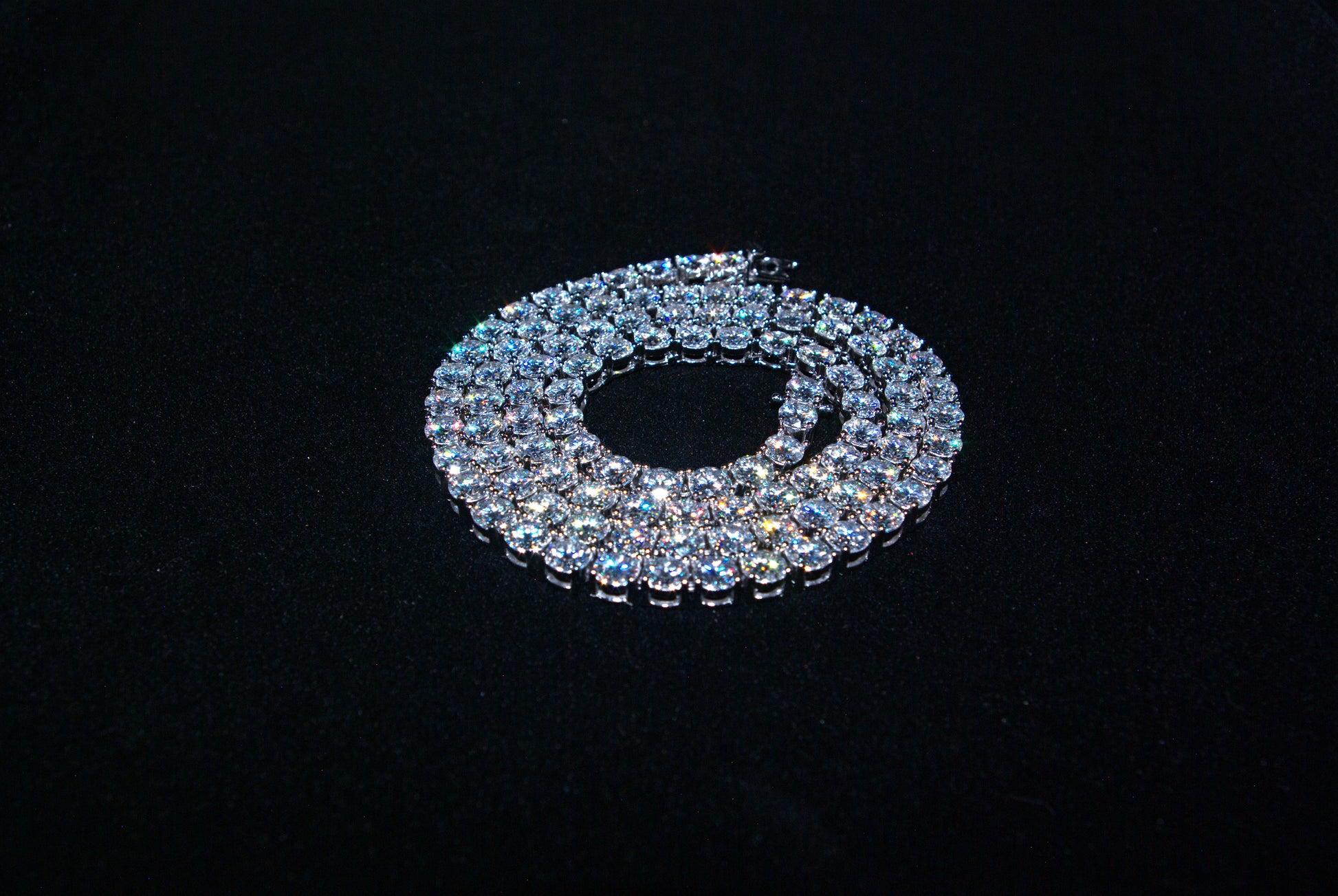 VVS1 Moissanite Tennis Chain – Sterling Silver with Rhodium Finish This tennis chain is crafted in solid Sterling Silver and plated with Rhodium to preserve its shine and resist tarnish. The stones are VVS D-Color Moissanite, cut for exceptional fire and brilliance. Each is guaranteed to pass a diamond tester. Designed to maintain its luster and elegance in any setting — including everyday wear.